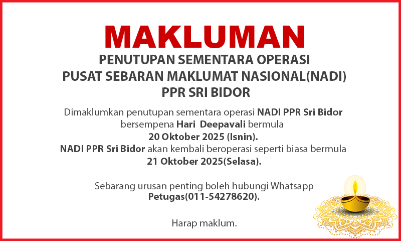 Tarikh : 25 & 27 Oktober 2025 Masa : 2:00pm – 3:00pm Tempat : NADI PPR Sri Bidor